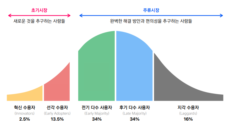 - 지각 수용자 (Laggards, 16%) : 개인적인 성향 또는 경제적 이유로 좀처럼 신기술을 받아들이지 않는 사람들