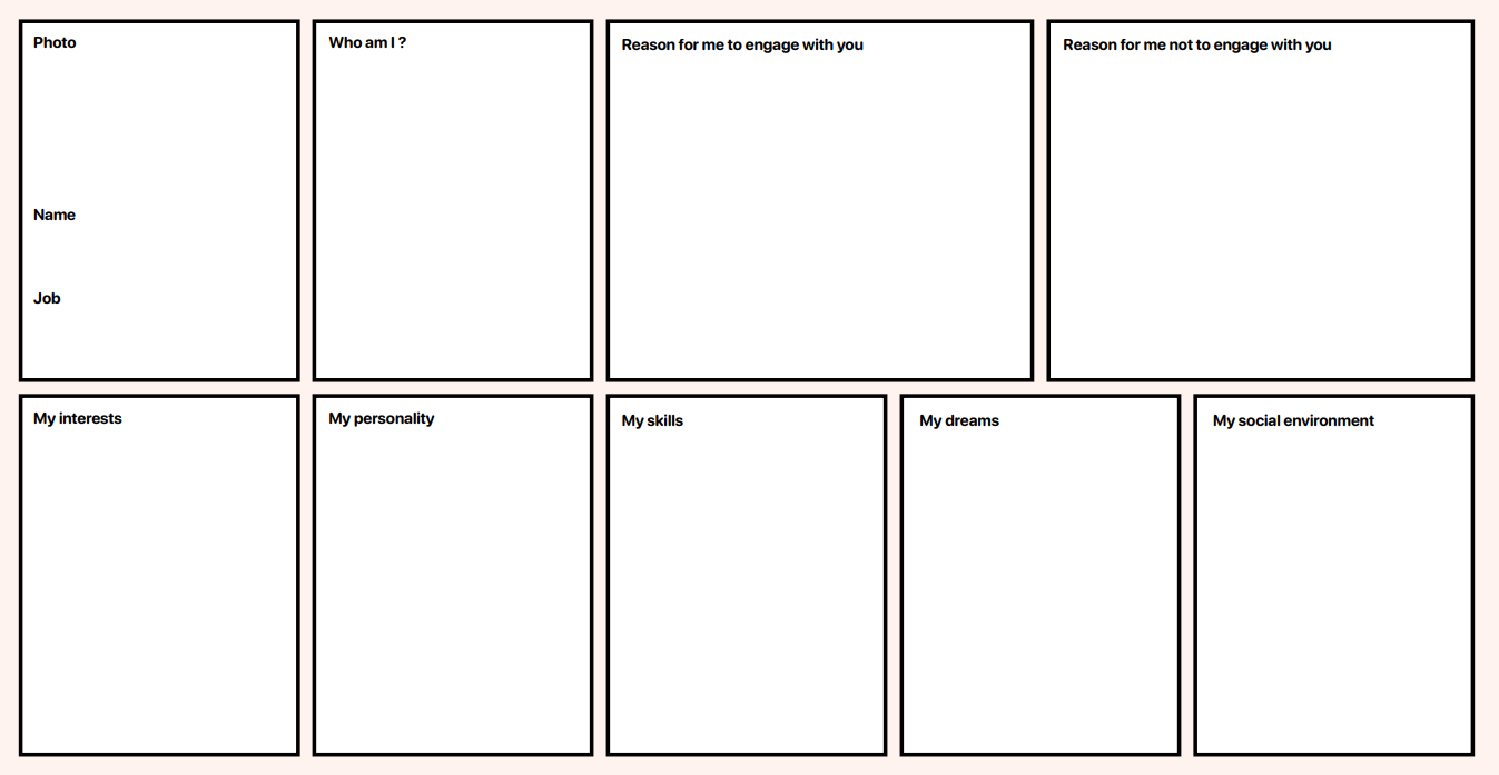 - 관심사 (My interests) : 퍼소나와 우리 제품의 접점이 되는 관심사. 제품의 대한 태도를 예상할 수 있는 관심사.