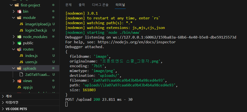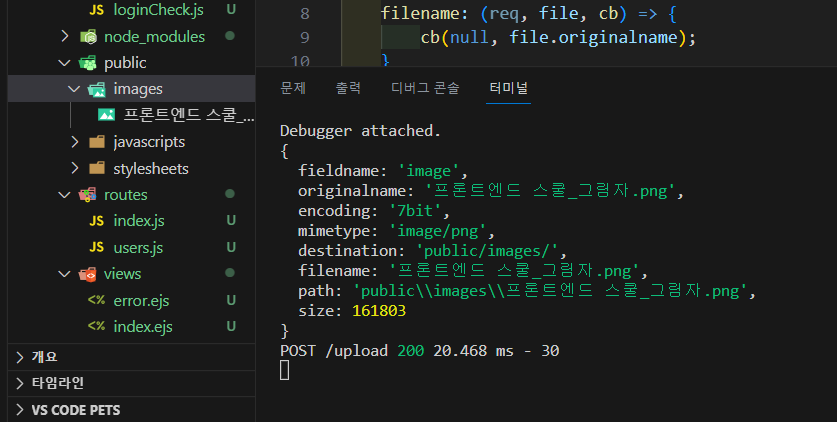 - 업로드 된 파일은 req.file 에서, 나머지 요청 데이터는 req.body 에서 불러와 사용할 수 있다.