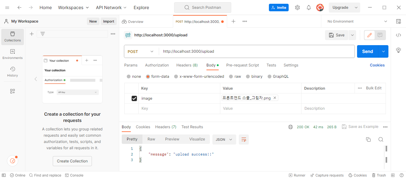 upload.single("image");- FormData 전송이란 Postman 에서 body type 중 하나인 form-data 이다.