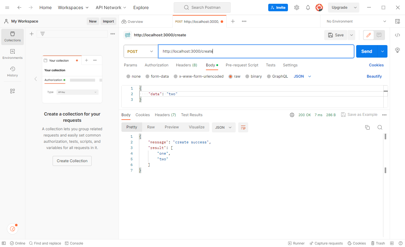 var express = require('express'); var router = express.Router(); let arr = []; // GET method router.get('/read', (req,res) => { res.status(200).json({ message: "read success" }); }); // POST method router.post('/create', (req,res) => { // console.log(req.body); const {data} = req.body; // 비구조화 할당 arr.push(data); res.status(200).json({ message: "create success", result: arr, }) }) // PUT method // update/0 : 0번째 데이터를 수정 (id === 0) router.put('/update/:id', (req,res) =>{ const {id} = req.params; // console.log(id); const { data } = req.body; arr[id] = data; res.status(200).json({ message: "update sucess", result: arr, }); }); // DELETE method router.delete('/delete/:id', (req,res) => { const {id} = req.params; arr.splice(id,1); res.status(200).json({ message: "delete success", result: arr, }) }) module.exports = router;- 데이터를 넣을 빈 배열을 하나 선하고 앞서 GET, POST 를 배웠던 것을 복습해보자