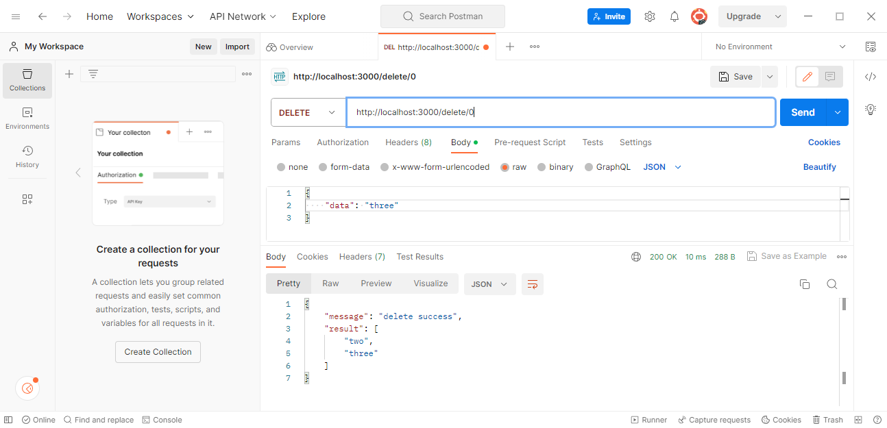 PUT 방식으로 새로운 데이터를 보내 배열의 값을 hello로 변경 할 수 있다 - 다시 POST로 데이터를 넣고, DELETE 방식으로 지정 배열의 데이터를 지울 수 있다.