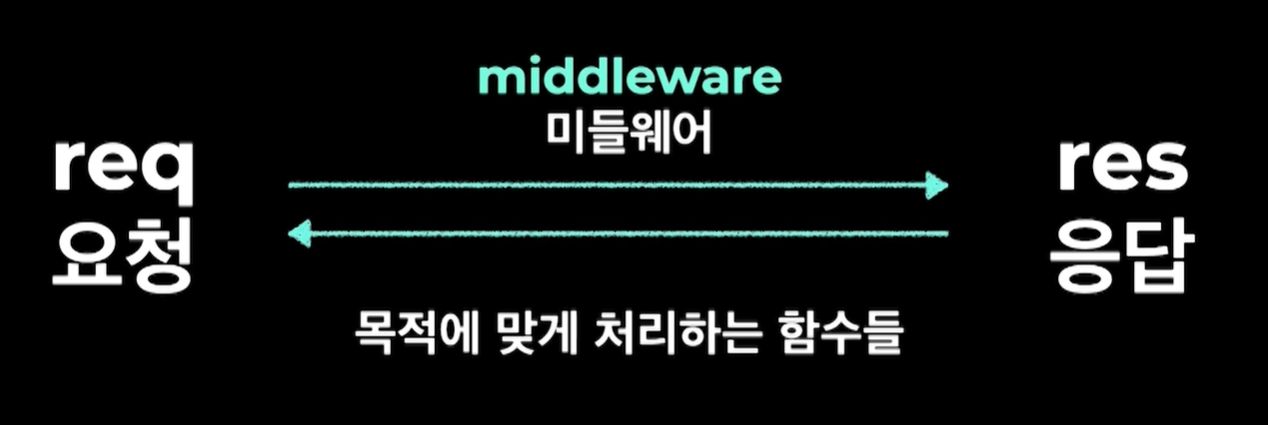 - 미들웨어란 요청(request)이 들어오고 응답(response) 을 하기까지 사이에서 목적에 맞게 처리하는 함수들