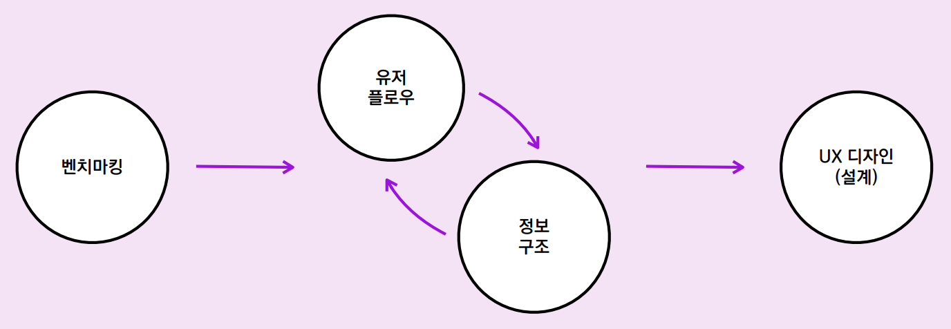 - 먼저 유사 및 경쟁 제품의 IA를 벤치마킹하고 유저 플로우 (User Flow)를 만든 뒤 IA를 1차로 만들고 다시 이 과정을 반복하는 것이 효율적임