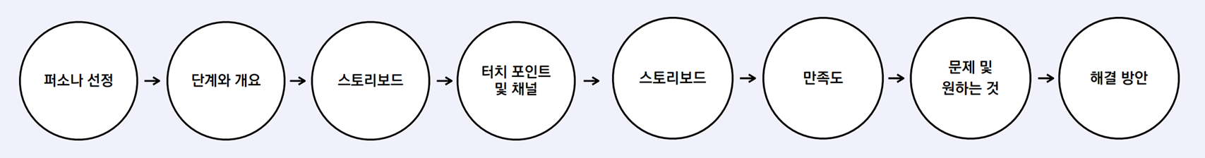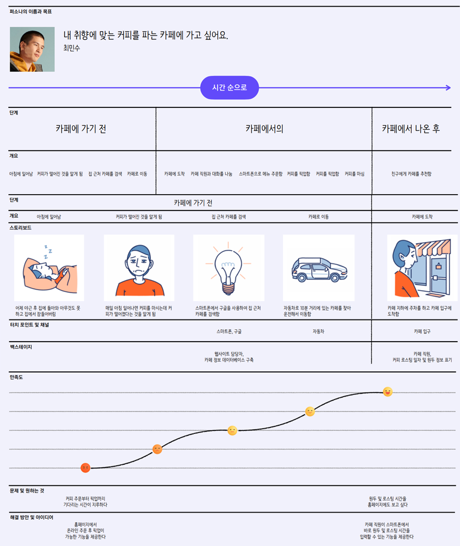 - 퍼소나가 자신의 목표를 달성하는 과정에서 시간 순서에 따라 어떤 경험을 하게 되는지를 시각화하는 작업