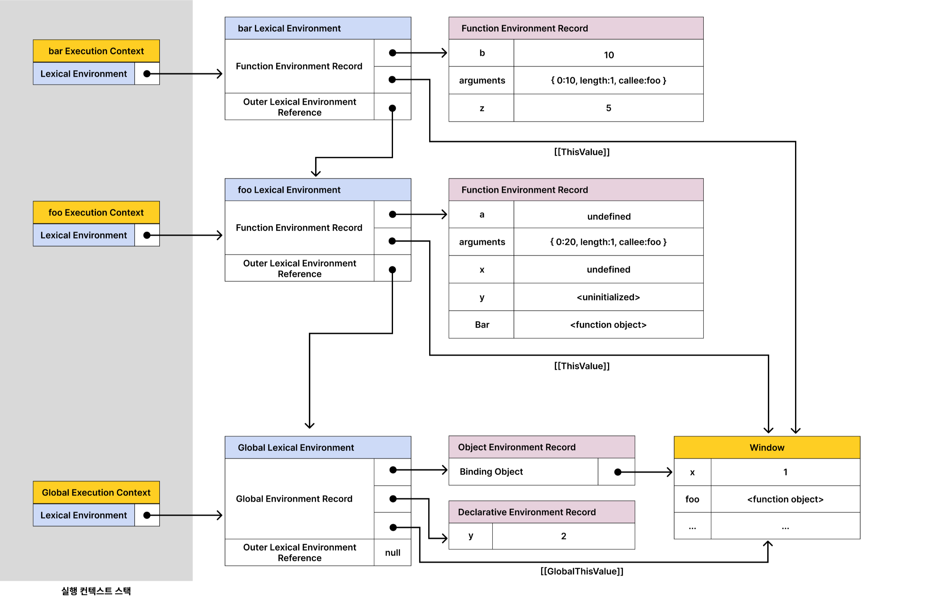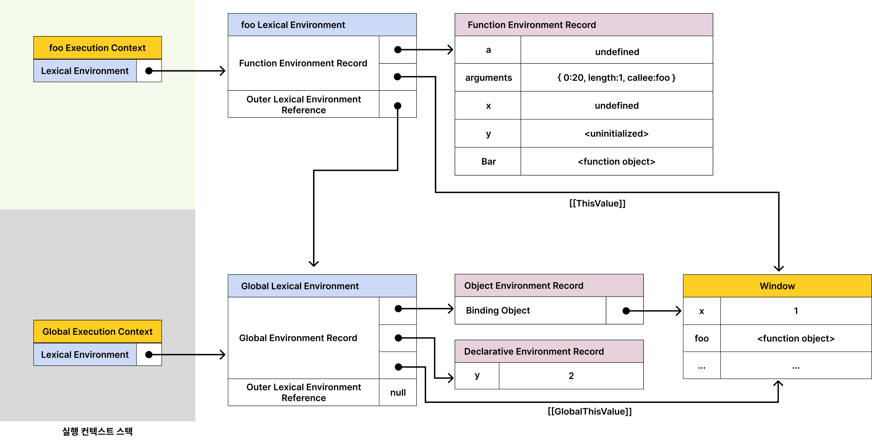 - foo 함수 렉시컬 환경을 생성하고 foo 함수 실행 컨텍스트에 바인딩 한다. 렉시컬 환경은 환경 레코드와 외부 렉시컬 환경에 대한 참조, 2개의 컴포넌트로 구성된다.