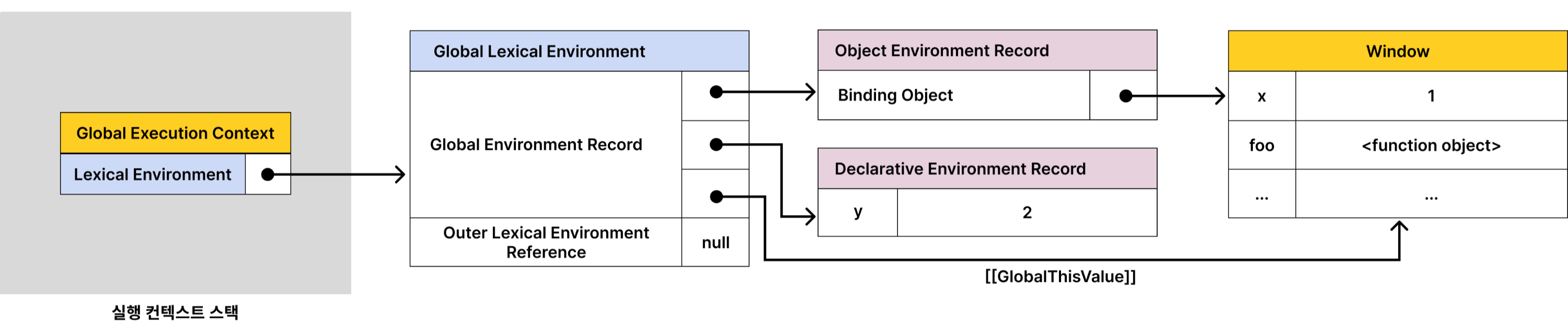 - 이때 등록된 식별자를 객체 환경 레코드에서 검색하면 전역 객체의 프로퍼티를 검색하여 반환한다.