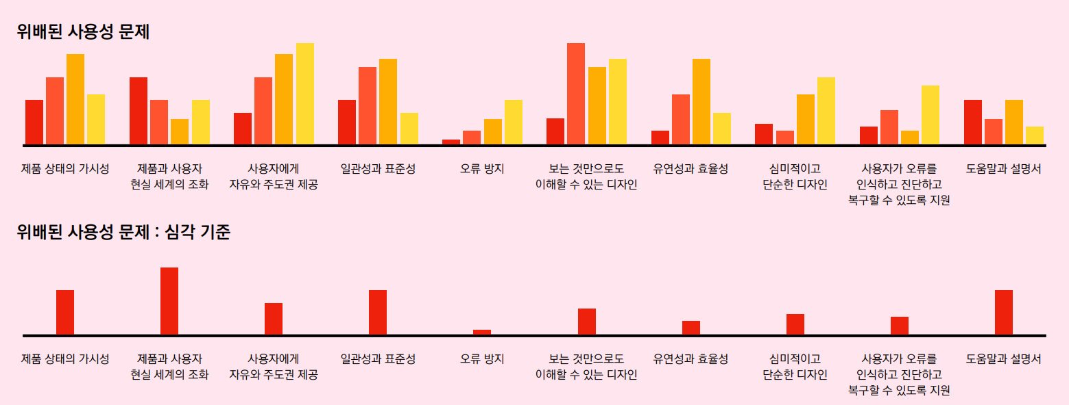 휴리스틱 평가지 - 휴리스틱 평가 분석 결과는 평가한 제품에서 어떤 사용성 문제가 가장 많이 발생하는 지 한 눈에 보이도록 작성