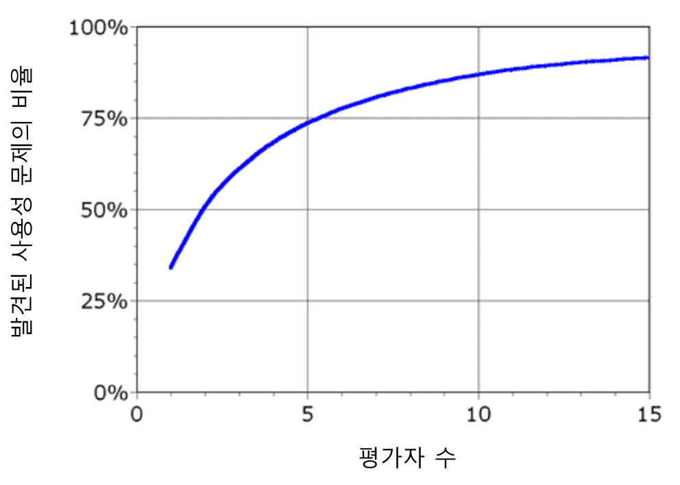- 가장 효율적인 평가자 수 : 5명의 평가자를 통해 사용성 문제의 약 75% 발견 가능 (최소 3명, 평균 5명 권장)