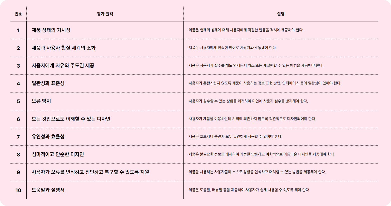 - 주로 제이콥 닐슨 (Jakob Nielsen) 의 10가지 사용성 평가 기준을 사용