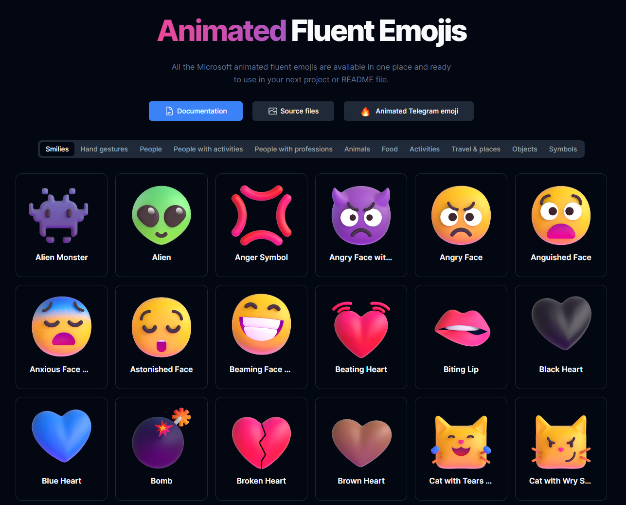 GitHub의 다양한 이모지들 - Animation Fluent Emojis에서는 귀여운 애니메이션 이모지를 가져와서 사용할 수 있다.