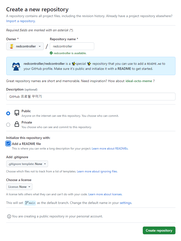 - Add a README file 을 체크하고 레포지토리를 생성해준다.
