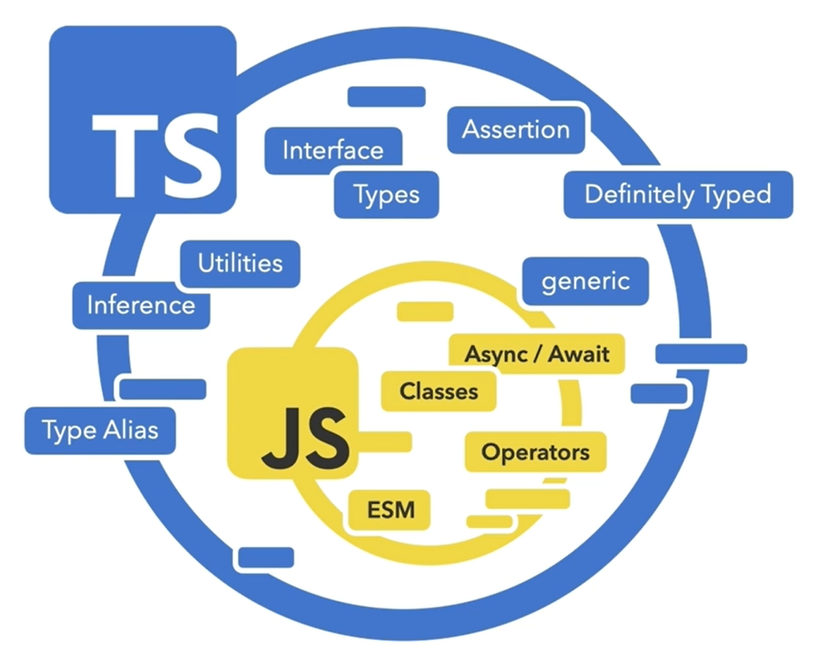 TypeScript는 JavaScript의 모든 기능을 포함 그외 추가로 TypeScript 문법에서는 사용할 수 있는 새로운 기능들로 Interface, Types, Assertion, generic, Utilities, Type Alias 등이 존재함 TypeScript라는 프로그래밍 언어를 새롭게 따로 배우는 것이 아니라, JavaScript에서 배운 문법을 기준으로 해서 TypeScript의 추가적인 기능을 살펴보는 것 즉, JavaScript 문법에 추가적인 정적 타입 문법을 추가로 배운다고 이해할 수 있다. JavaScript를 잘 다룬다면 TypeScript 내용이 쉽게 다가올 수 있을 것이다.