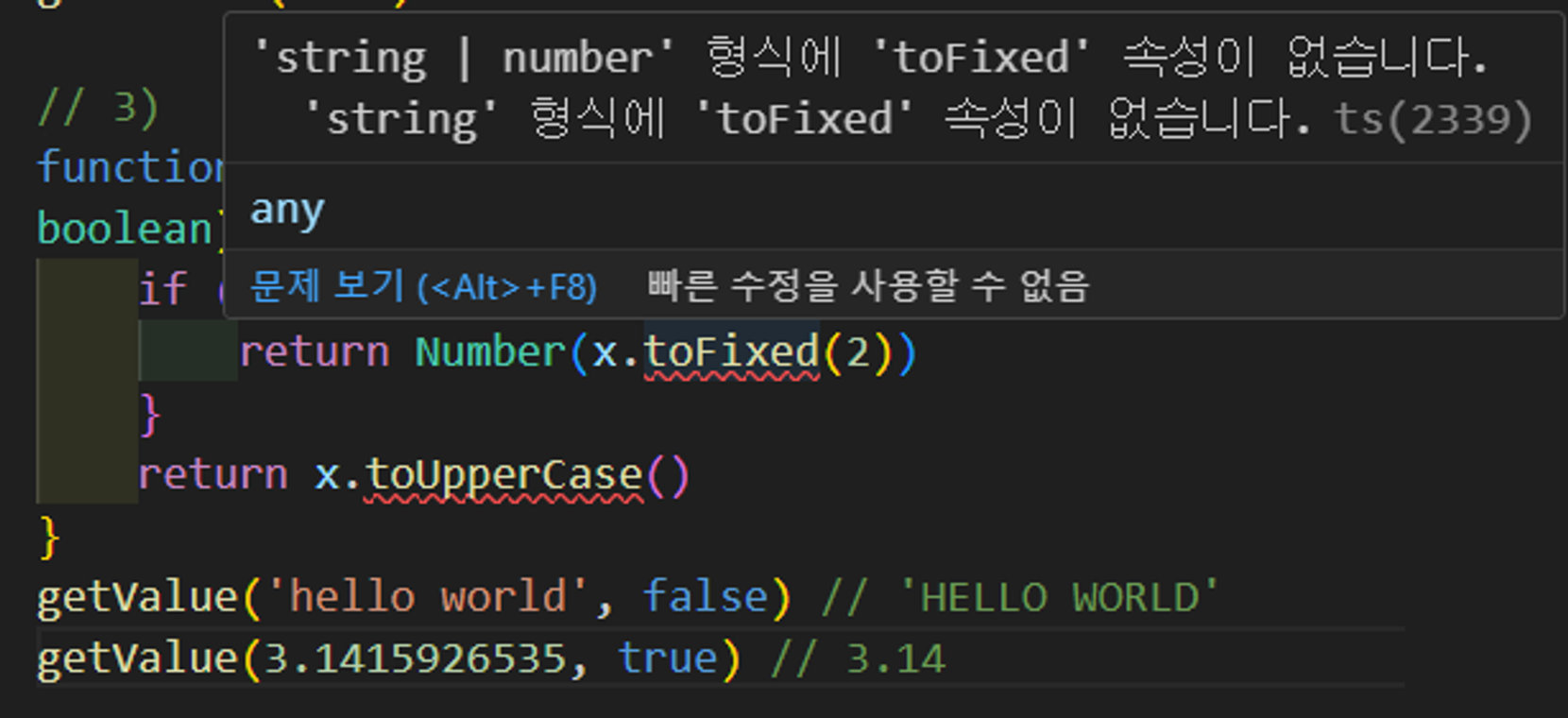 function getValue(x: string | number, isNumber: boolean) { if (isNumber) { return Number((x as number).toFixed(2)) } return (x as string).toUpperCase() } getValue('hello world', false) // 'HELLO WORLD' getValue(3.1415926535, true) // 3.14메서드(속성)를 사용하는 곳에 타입 단언 키워드(as)를 사용할 때는 문법적으로 정확하게 어디에서 실행되는지 소괄호를 사용하여 명시해준다.