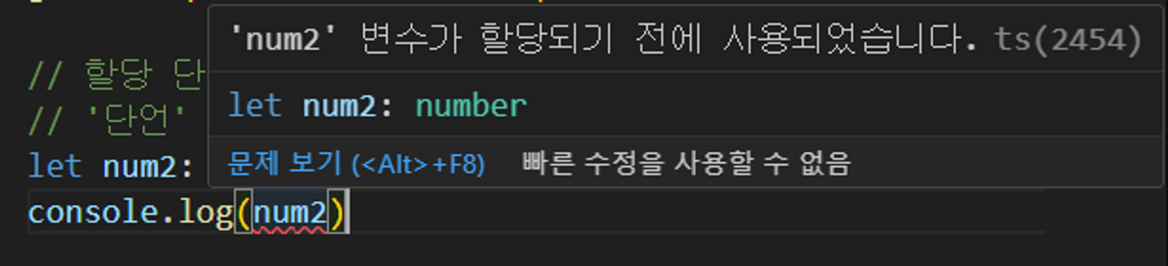 변수 할당 전에 사용하여 발생하는 에러 타입스크립트 입장에서는 엄격하게 값이 number 타입 변수에 숫자형의 데이터가 할당되지 않은 상태로 변수가 사용되고 있다고 에러를 표시하는 것이다.