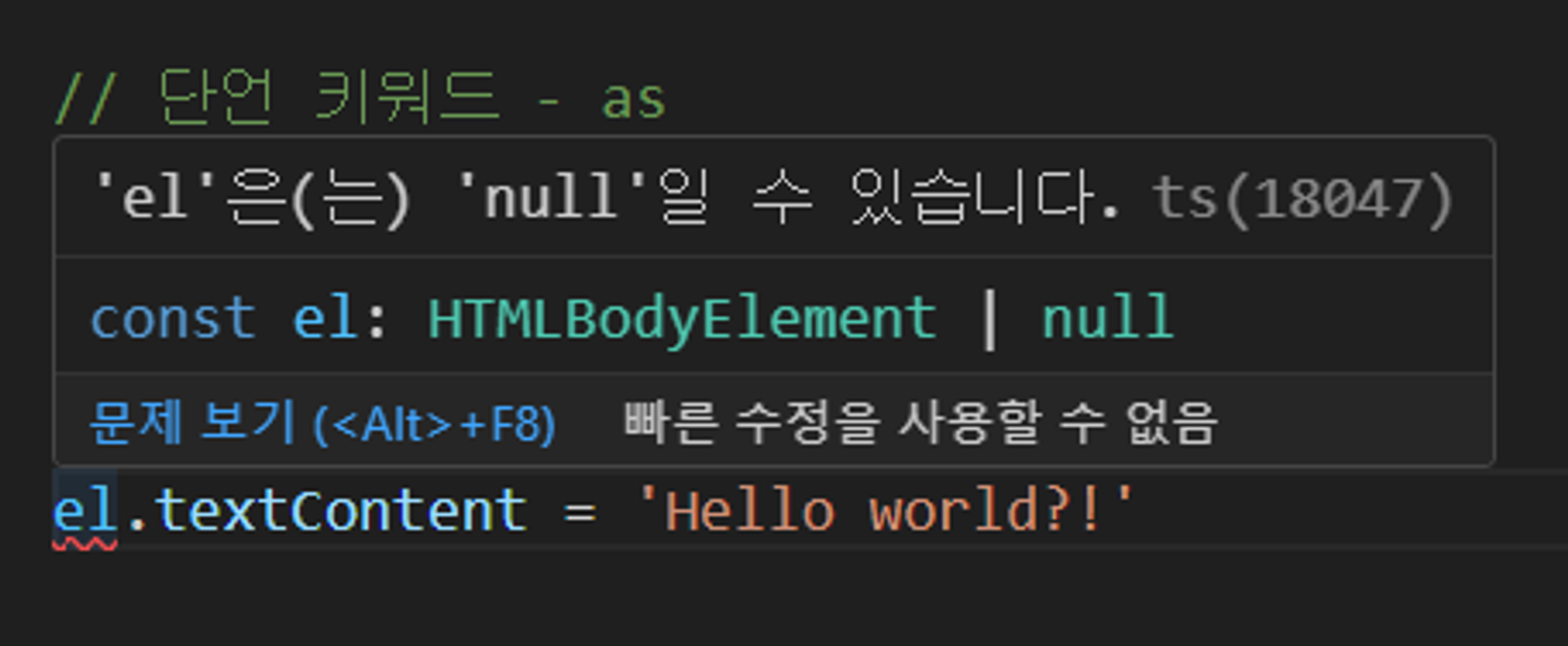 첫 번째 예제를 단언 키워드와 Not-null 단언 연산자를 통해서 해결할 수 있었지만, body 대신 다른 태그가 들어간다면 다시 에러가 발생할 수 있다. 이 경우에는 el 변수에 데이터가 있을 경우, 즉 querySelector가 요소를 잘 찾게 되면 null 데이터가 아닐테니 물리적으로 if 조건 안으로 들어갈 수 있는 상황이 된다. 이렇게 if 조건을 통해서 물리적으로 el 변수가 있을 때만 textContent 속성을 사용하도록 만들어주면 타입스크립트랑 상관없이 실제 JavaScript 코드를 통해서 문제를 해결할 수가 있다.