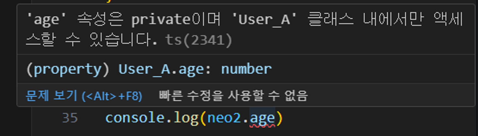 UserA 클래스의 age 속성을 private 접근 제어자로 수정하면, age 라는 속성은 내 클래스에서만 접근 가능하기 때문에 usreA라는 클래스 내부에서 this 키워드를 통해서 접근하는 것은 전혀 문제가 되지 않지만, UserA를 벗어난 하위 클래스에서는 역시 접근을 할 수 없다. 나아가서 클래스 밖(인스턴스)에서 해당하는 age 속성을 조회하는 것도 불가능하다. (Error 발생)