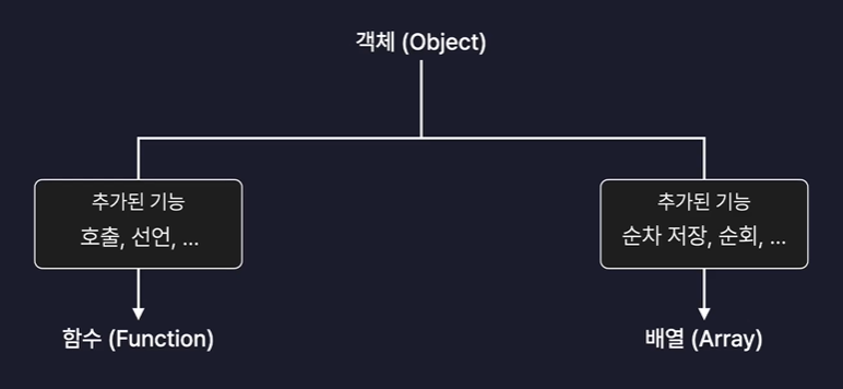 - JavaScript의 배열과 함수는 특수한 객체들이기 때문에 배열과 함수 또한 일반 객체에 존재하는 프로퍼티와 메서드를 다 가지고 있다. 배열과 함수는 일반 객체에 추가적인 프로퍼티나 메서드를 가진다고 이해할 수 있다.