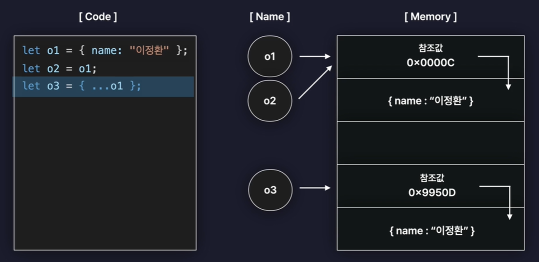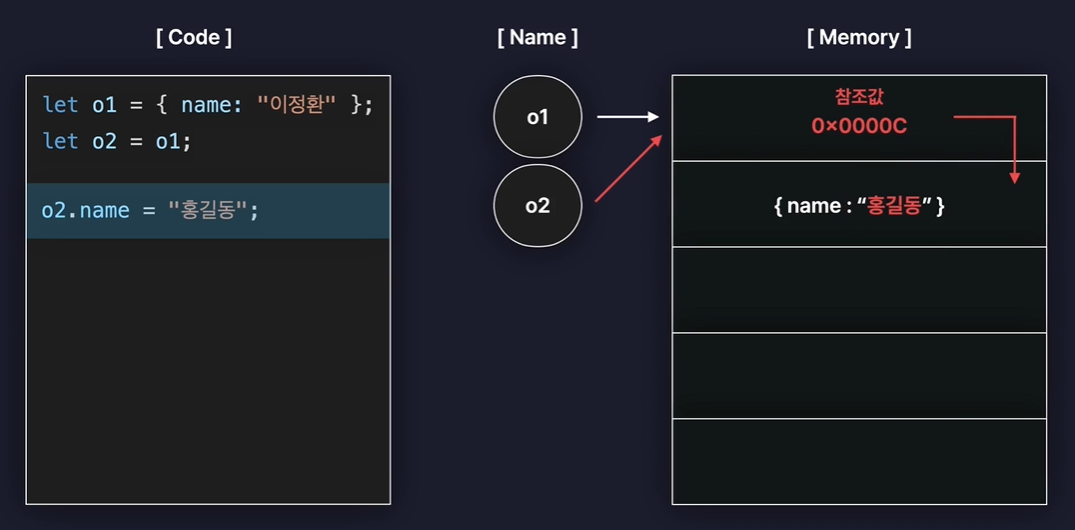- 만약 o1과 o2를 일치 연산자(===)로 비교를 하면 결괏값으로 true가 나온다. 현재 같은 구조의 객체를 보관하고 있을 뿐만 아니라 참조값까지 동일하기 때문에 당연히 서로 같은 값으로 평가된다.
