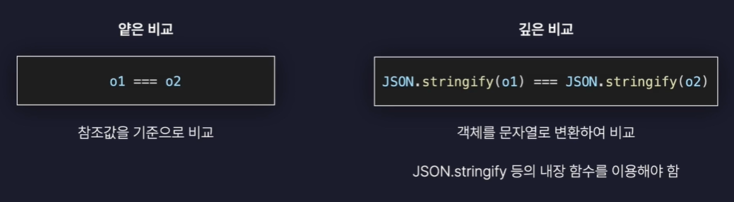 let o1 = {name: "홍길동"}; let o2 = o1; let o3 = {...o1}; console.log(o1 === o2); // true console.log(o1 === o3); // false console.log( JSON.stringify(o1) === JSON.stringify(o3) ); // true- 이때 참조값을 기준으로 비교하는 방식을 얕은 비교, JSON.stringify()와 같이 객체를 문자열로 변환하여 내부 프로퍼티를 기준으로 비교하는 방식을 깊은 비교라고 표현한다. 정리하면, 객체값을 서로 비교할 때 객체의 참조값이 같은지 비교하려면 얕은 비교를, 그게 아닌 객체의 프로퍼티의 값을 기준으로 비교하려면 깊은 비교를 수행한다.