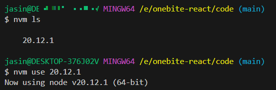 nvm ls // 설치된 버전 목록 불러오기 nvm use 20.12.1 // 기본 node 버전 설정