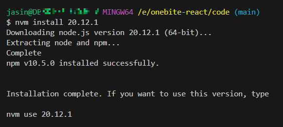 nvm install 20.12.1 # - LTS node.js 최신버전 설치: nvm install lts # - 일반 node.js 최신버전 설치: nvm install node # - 20번대 최신버전 설치: nvm install 20 # - 설치 삭제: nvm uninstall <version>