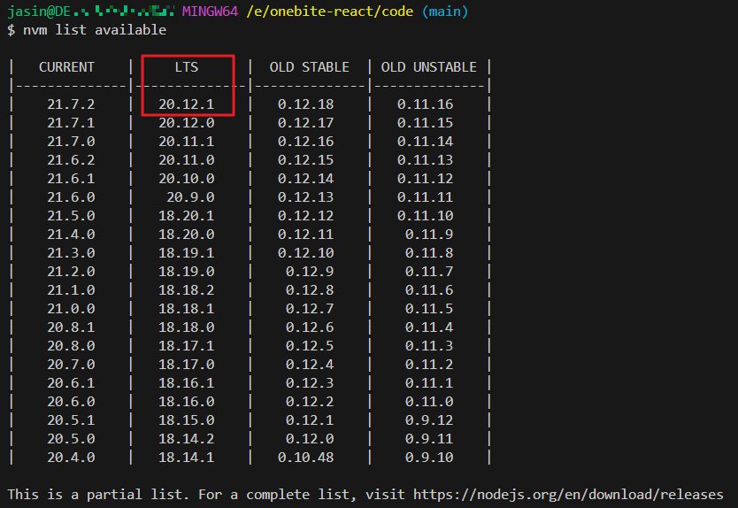 앞서 설치 가능한 node.js 목록을 보면 LTS 열을 보면 가장 위에 있는 버전이 설치 가능한 최신 버전이다.