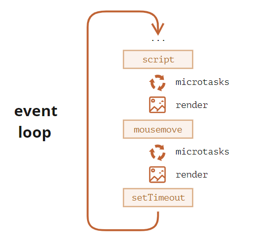 JavaScript 엔진은 매크로태스크 하나를 처리할 때마다 또 다른 매크로태스크나 렌더링 작업을 하기 전에 마이크로태스크 큐에 쌓인 마이크로태스크 전부를 처리합니다. 그림을 보면 매크로태스크(script, mousemove, setTimeout 등) 하나가 처리되고 난 후 마이크로태스크 전부(microtasks)가 처리되고 그 이후 렌더링이 진행됩니다. 다시말해, 마이크로태스크는 다른 이벤트 핸들러나 렌더링 작업, 혹은 다른 매크로태스크가 실행되기 전에 처리됩니다.