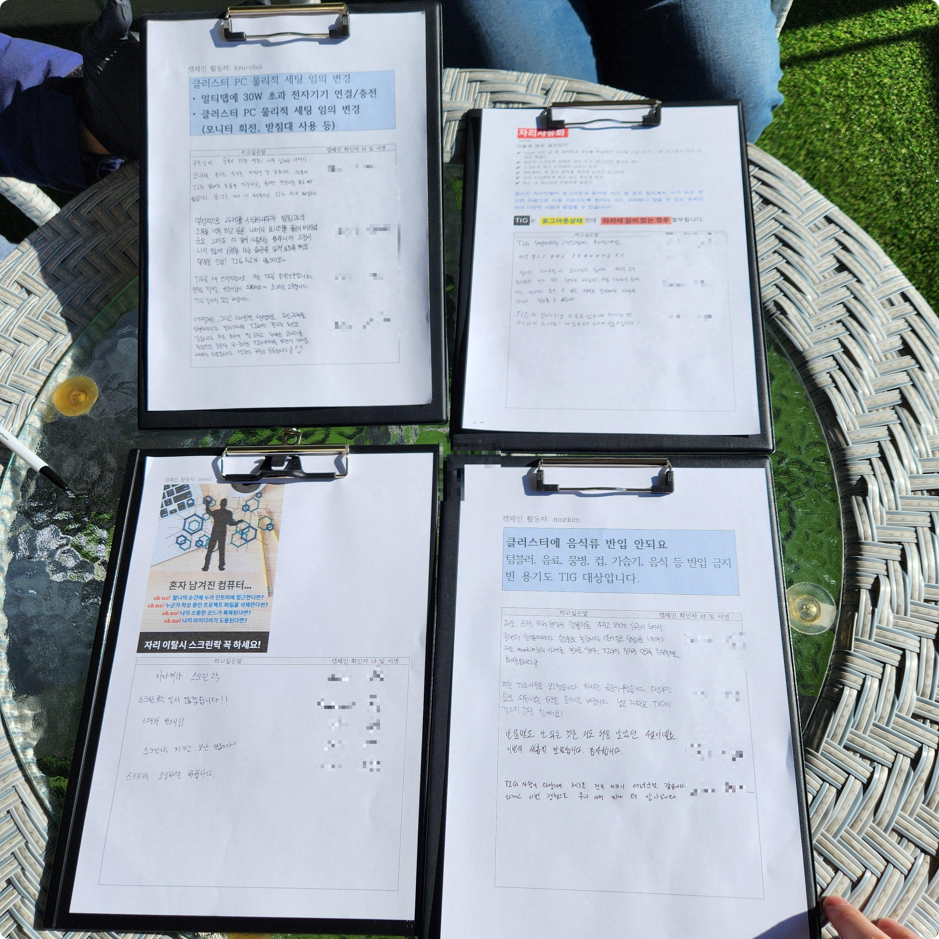 이곳에서는 정해진 규칙이 있는데, 예를 들면 컵이나 음식물 반입 금지, 자리 사유화 금지, 클러스터 내 PC 모니터를 회전 금지 등등이 있습니다. 이를 지키지 않으면 TIG 사유가 되고, TIG에 걸린 사람은 다른 동료에게 피해를 준 것이기 때문에 TIG 1회당 캠페인 활동과 봉사활동 2시간을 해야 합니다. 저도 한 번 TIG에 걸린 적이 있었는데, 시험공부나 과제를 밀어야 할 시간도 부족하니 본인과 동료들을 위해 TIG에 걸리지 않도록 주의해 주세요!5. 밥! 밥! 밥!