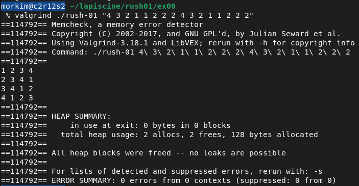 # 프로그램 컴파일 (-g 옵션으로 디버깅 정보를 추가) cc -g myprogram.c -o myprogram # valgrind 실행 valgrind ./mygrogramvalgrind를 통한 malloc 메모리 누수 확인