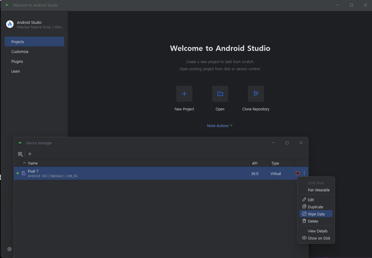 애뮬레이터에 설치된 앱 데이터 제거 2) 프로젝트 수동 재설치 및 실행