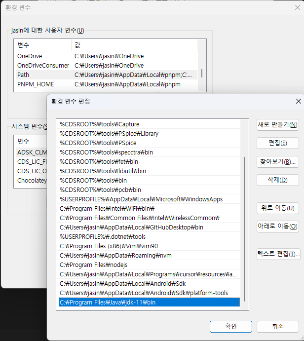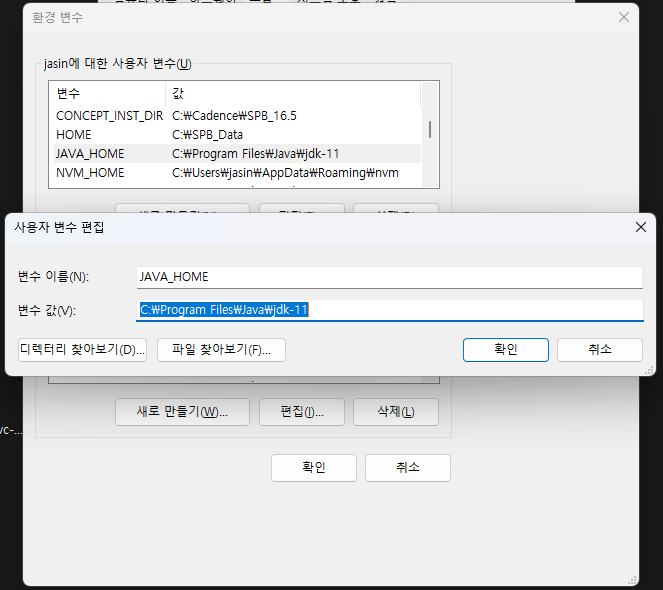 현재 java 버전을 확인해보고, 나는 블로그 글에 맞춰서 Java 11 설치 및 Windows 환경변수 설정을 해줬다. Java 11 SDK를 다운받기 위해서는 Oracle 홈페이지에 들어가서 로그인을 해줘야 한다. 그리고 Windows에서 인식할 수 있도록 아래에 있는 이미지처럼 JAVA_HOME 변수와 path에 java 11 bin 폴더의 경로를 추가해줬다.