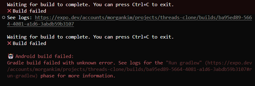 지금까지 eas build에도 시간은 걸렸으나 에러는 발생하지 않았다. 그런데 이번에 google-services.json이나 FCM 서비스 계정 정보를 등록하면서 eas build에서 에러가 발생했다. EAS 무료 사용자이다 보니 작업 큐에서 시간을 너무 많이 사용하여 아래 명령어로 수행을 했다. eas build와 다르게 아래 명령어는 android 폴더를 생성하는 prebuild를 수행했다. 그러면서 gradle 에러가 발생하기 시작했다.