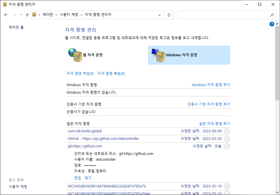 Windows 자격 증명 관리에 Token 적용하기 - git 설정