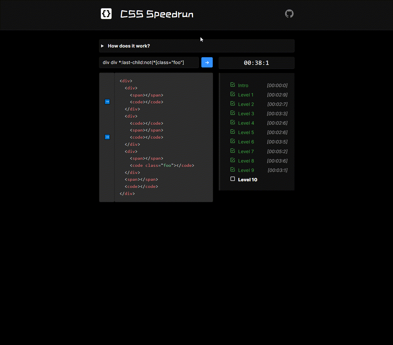 no. 내 풀이 정답 Inro li:first-child li:first-child Level 1 p:not(*[class="foo"]) p:not(.foo) Level 2 li:nth-child(odd):not(:first-child) li:nth-child(2n + 3) Level 3 div > * div > * Level 4 span[data-item] span[data-item] Level 5 p ~ span p ~ span Level 6 form *:not(*[disabled]) :enabled Level 7 li[id="one"],li[id="two"],li[id="five"],li[id="six"],li[id="nine"] #one, #two, #five, #six, #nine Level 8 a+span a + span Level 9 div[id="foo"] > div[class="foo"] #foo > .foo Level 10 div div *:last-child:not(*[class="foo"] div div span + code:not(.foo) 'Front-end 개발' 카테고리의 다른 글