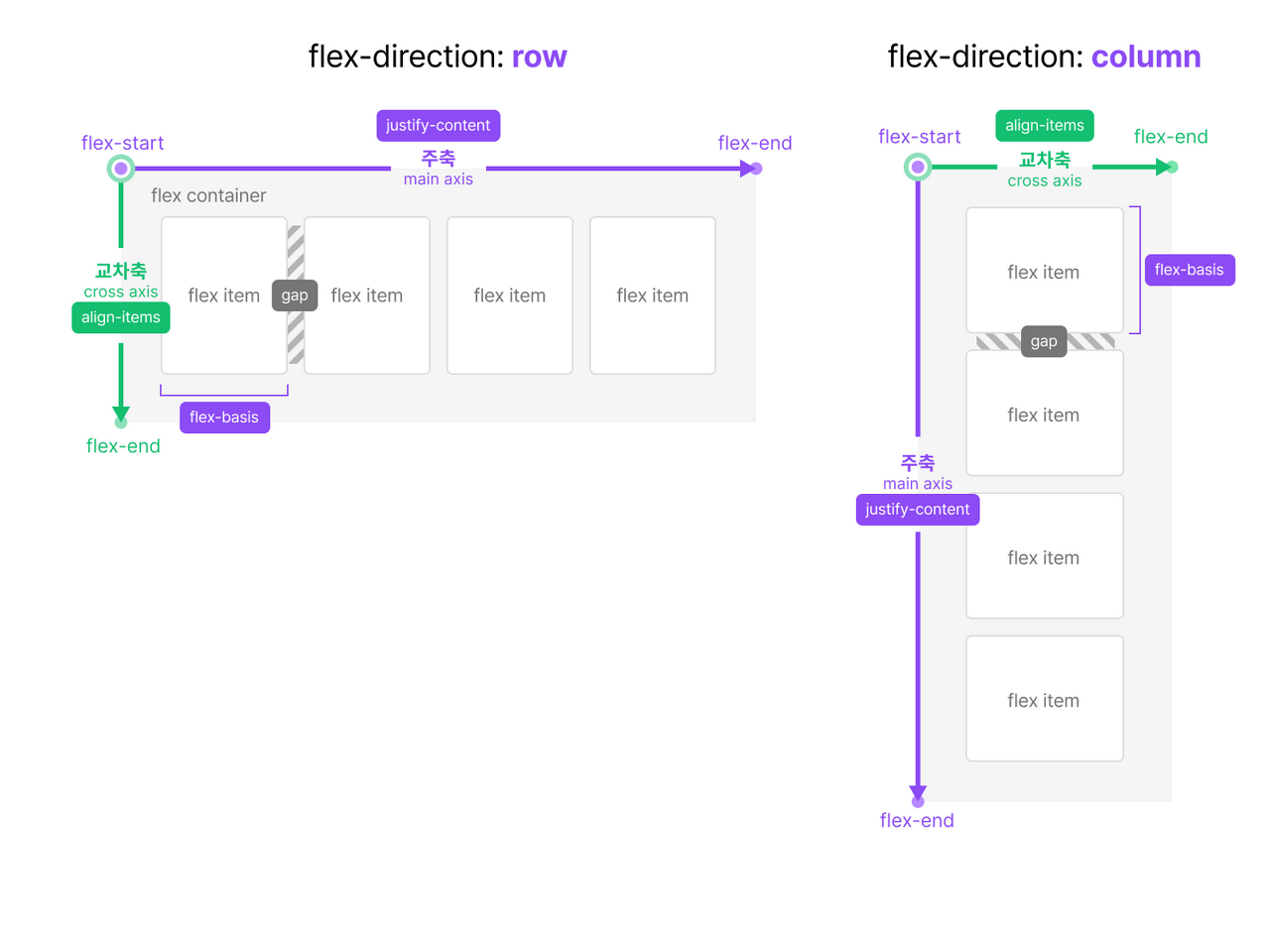 - flex-direction 과 justify-conten 의 축과 지점(start, end)