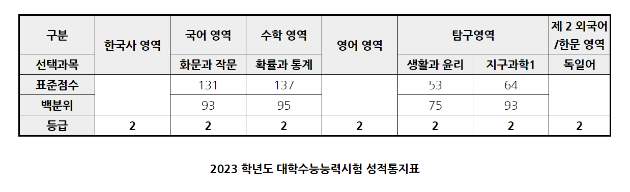 <!DOCTYPE html> <html lang="ko-KR"> <head> <meta charset="UTF-8"> <meta http-equiv="X-UA-Compatible" content="IE=edge"> <meta name="viewport" content="width=device-width, initial-scale=1.0"> <title>수능표 만들기</title> <style> table { width: 90%; margin: 30px auto; border-collapse: collapse; table-layout: fixed; border: 2px solid black; font-size: 15px; line-height: 160%; } caption { caption-side: bottom; margin-top: 30px; font-weight: bold; } th, td { border: 1px solid black; text-align: center; } th { background-color: #eee; } tfoot { font-weight: bold; } </style> </head> <body> <!-- <h2>수능표 만들기</h2> --> <table> <caption>2023 학년도 대학수능능력시험 성적통지표</caption> <thead> <tr> <th>구분</th> <th rowspan="2">한국사 영역</th> <th>국어 영역</th> <th>수학 영역</th> <th rowspan="2">영어 영역</th> <th colspan="2">탐구영역</th> <th style="width: 10%;">제 2 외국어<br>/한문 영역</th> </tr> <tr> <th>선택과목</th> <th>화문과 작문</th> <th>확률과 통계</th> <th>생활과 윤리</th> <th>지구과학1</th> <th>독일어</th> </tr> </thead> <tbody> <tr> <th>표준점수</th> <td rowspan="2"></td> <td>131</td> <td>137</td> <td rowspan="2"></td> <td>53</td> <td>64</td> <td rowspan="2"></td> </tr> <tr> <th>백분위</th> <td>93</td> <td>95</td> <td>75</td> <td>93</td> </tr> </tbody> <tfoot> <tr> <th>등급</th> <td>2</td> <td>2</td> <td>2</td> <td>2</td> <td>2</td> <td>2</td> <td>2</td> </tr> </tfoot> </table> </body> </html>Github 링크