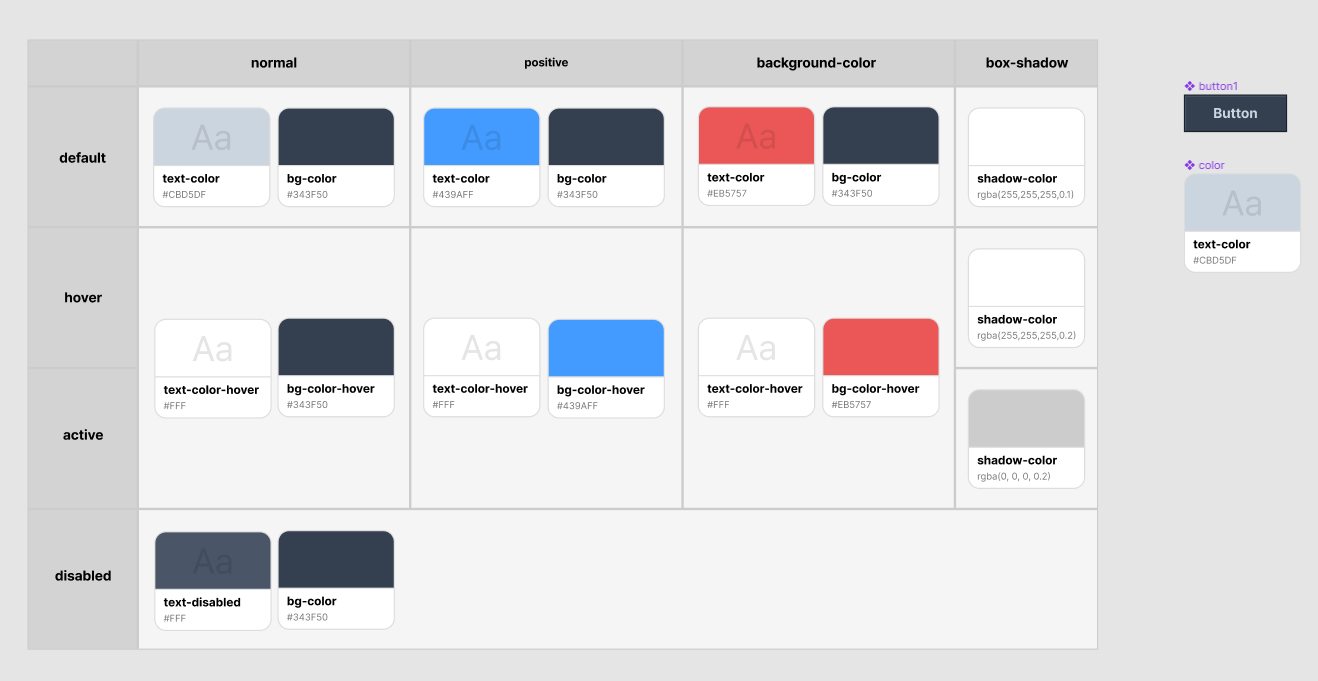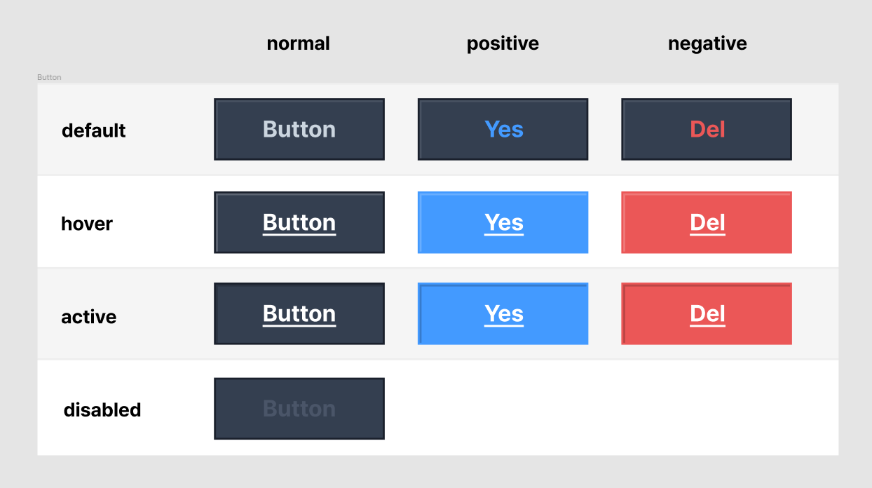 <!DOCTYPE html> <html lang="ko"> <head> <meta charset="UTF-8"> <meta http-equiv="X-UA-Compatible" content="IE=edge"> <meta name="viewport" content="width=device-width, initial-scale=1.0"> <title>버튼 만들기</title> <style> @font-face { font-family: 'Pretendard-Regular'; src: url('https://cdn.jsdelivr.net/gh/Project-Noonnu/noonfonts_2107@1.1/Pretendard-Regular.woff') format('woff'); font-weight: 400; font-style: normal; } :root { /* text */ --default-color: #CBD5DF; --hover-color: white; --disabled-color: #4a5568; --default-color-positive: #439AFF; --default-color-negative: #EB5757; /* background */ --bg-color: #343F50; --bg-color-hover-positive: #439AFF; --bg-color-hover-negative: #EB5757; /* border */ --default-border-color: #1A202C; --hover-border-color-positive: #439AFF; --hover-border-color-negative: #EB5757; /* box-shadow */ --default-shadow-color: #4a5568; --active-shadow-color: #262f3e; --hover-shadow-color-positive: rgba(255, 255, 255, 0.20); --active-shadow-color-positive: rgba(0, 0, 0, 0.20); } button { width: 88px; height: 32px; font-family: 'Pretendard-Regular'; font-weight: 700; font-size: 12px; color: var(--hover-color); background-color: var(--bg-color); border: 2px solid var(--default-border-color); } .btn1:enabled { color: var(--default-color); box-shadow: inset 2px 2px 0 0 #4a5568; } .btn1:enabled:hover { text-decoration: underline; box-shadow: inset 2px 2px 0 0 #4a5568; } .btn1:enabled:active { text-decoration: underline; box-shadow: inset 2px 2px 0 0 rgba(0, 0, 0, 0.20); } .btn2:disabled { color: var(--disabled-color); } .btn3:enabled { color: var(--default-color-positive); } .btn3:enabled:hover { color: var(--hover-color); background-color: var(--bg-color-hover-positive); text-decoration: underline; border: 2px solid var(--hover-border-color-positive); box-shadow: 2px 2px 0px 0px var(--hover-shadow-color-positive) inset; } .btn3:enabled:active { color: var(--hover-color); background-color: var(--bg-color-hover-positive); text-decoration: underline; border: 2px solid var(--hover-border-color-positive); box-shadow: 2px 2px 0px 0px var(--active-shadow-color-positive) inset; } .btn4:enabled { color: var(--default-color-negative); } .btn4:enabled:hover { color: var(--hover-color); background-color: var(--bg-color-hover-negative); text-decoration: underline; border: 2px solid var(--hover-border-color-negative); box-shadow: 2px 2px 0px 0px var(--hover-shadow-color-positive) inset; } .btn4:enabled:active { color: var(--hover-color); background-color: var(--bg-color-hover-negative); text-decoration: underline; border: 2px solid var(--hover-border-color-negative); box-shadow: 2px 2px 0px 0px var(--active-shadow-color-positive) inset; } </style> </head> <body> <button class="btn1" type="button">Button</button> <button class="btn2" type="button" disabled>Button</button> <button class="btn3" type="button">Yes</button> <button class="btn4" type="button">Del</button> </body> </html>Github 링크