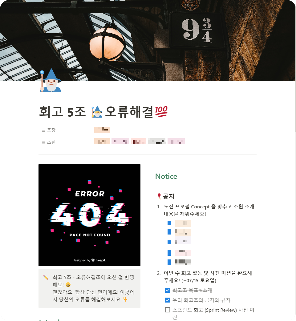노션 페이지는 회고조 이름인 '오류해결'을 정할 때 마법 처럼 오류를 해결하는 개발자 컵셉트대로 꾸몄다.