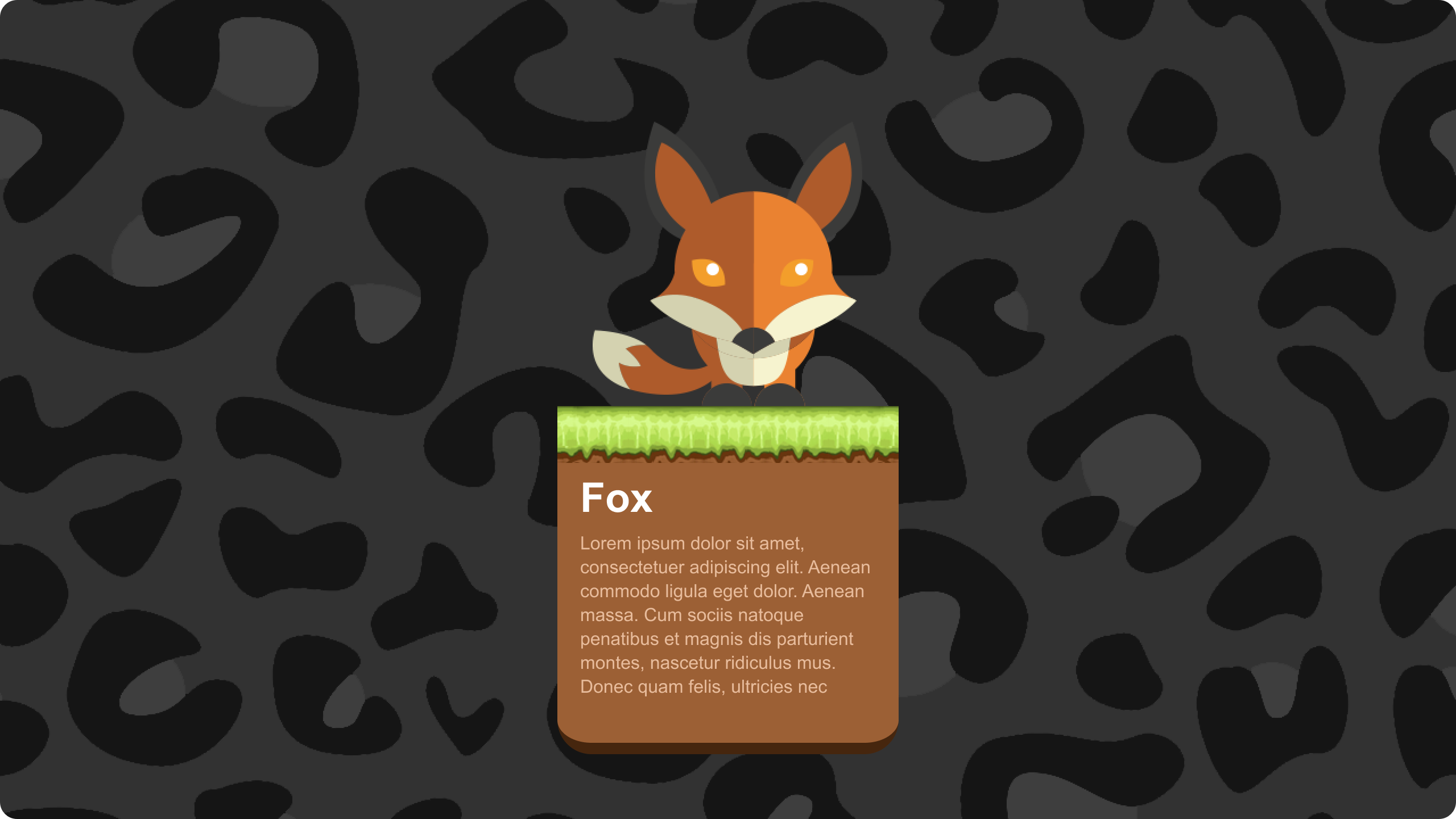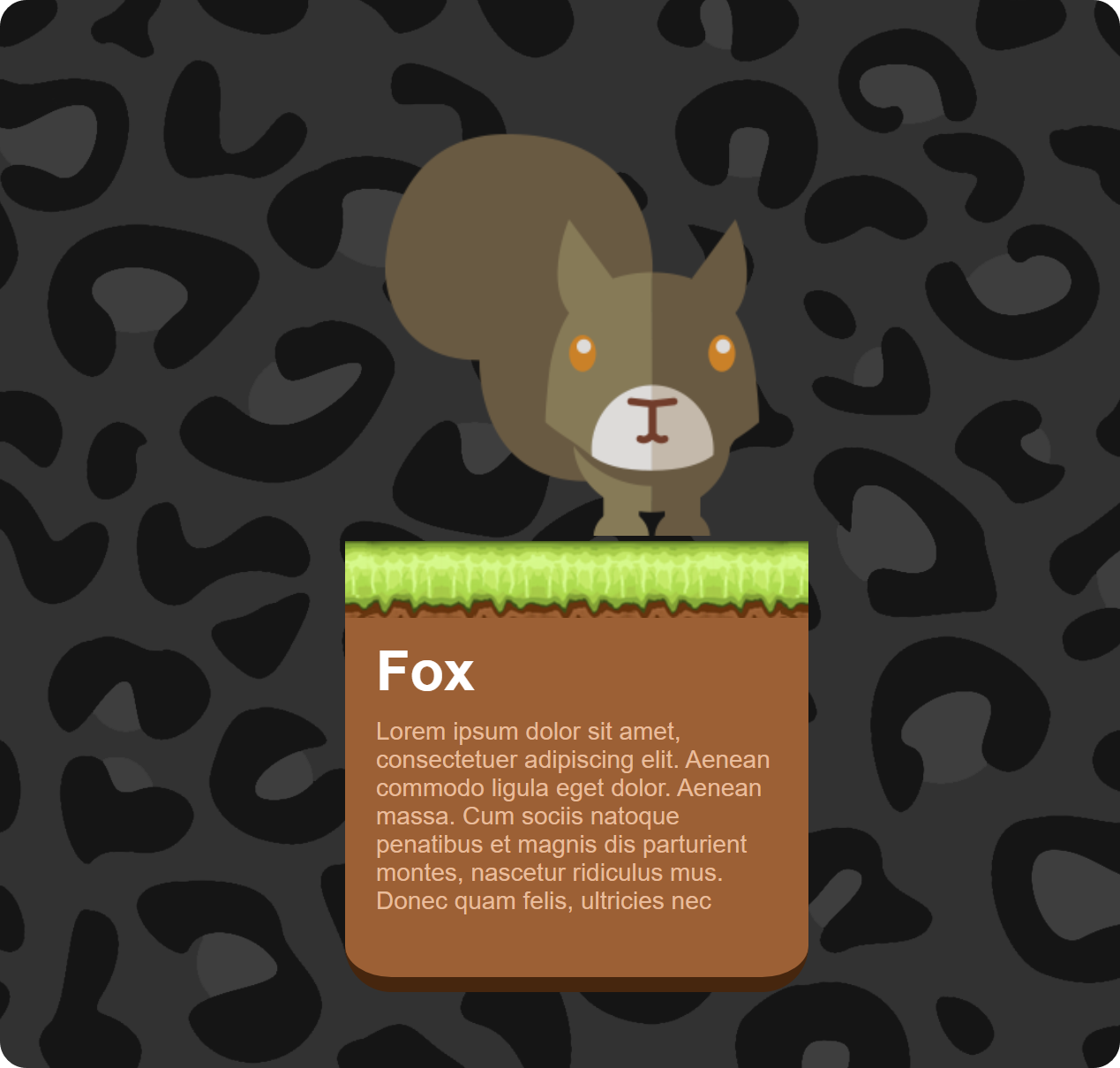 body, h2, div, p { margin: unset; } h2, p { font-family: Arial; } body { background-image: url(./images/bg.png); background-size: cover; background-repeat: no-repeat; } .wrap { width: 300px; margin: 50px auto; /* background-color: aquamarine; */ } .animals { width: 300px; height: 300px; background-image: url(./images/animal02.png), url(./images/animal03.png), url(./images/animal01.png), url(./images/animal04.png),url(./images/animal05.png), url(./images/animal06.png), url(./images/animal07.png), url(./images/animal08.png),url(./images/animal09.png); background-size: 150px 150px; background-repeat: no-repeat; background-position:75px 150px, 0px 150px, 150px 150px, 75px 95px, 0px 95px, 150px 95px, 65px 0px, 0px 0px, 150px 0px; } .main { background-color: #9C6035; border-radius: 0px 0px 30px 30px; border-bottom: 10px solid #46260E; } .desc { padding: 10px 20px; /* background-color: blue; */ } .desc > h2 { font-size: 28px; font-weight: 700; color: white; } .desc > p { font-size: 16px; font-weight: 400; color: #E8BC9C; padding-top: 10px; padding-bottom: 30px; }Github 링크