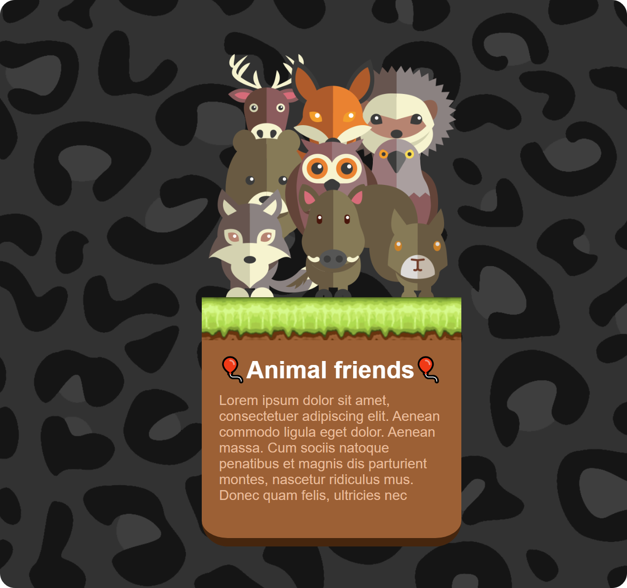 <!DOCTYPE html> <html lang="ko"> <head> <meta charset="UTF-8"> <meta http-equiv="X-UA-Compatible" content="IE=edge"> <meta name="viewport" content="width=device-width, initial-scale=1.0"> <title>Forest Zoo</title> <link rel="stylesheet" href="./style-1.css"> </head> <body> <article class="wrap"> <div class="animals"></div> <div class="main"> <img src="./images/green.png" alt="ground"> <div class="desc"> <h2>🎈Animal friends🎈</h2> <p>Lorem ipsum dolor sit amet, consectetuer adipiscing elit. Aenean commodo ligula eget dolor. Aenean massa. Cum sociis natoque penatibus et magnis dis parturient montes, nascetur ridiculus mus. Donec quam felis, ultricies nec</p> </div> </div> </article> </body> </html>3-2. CSS
